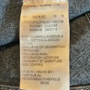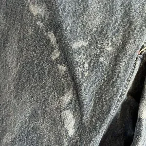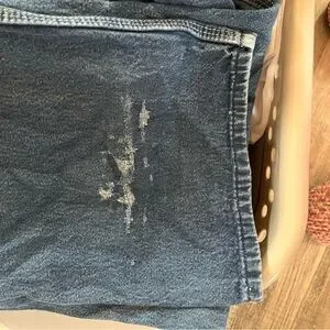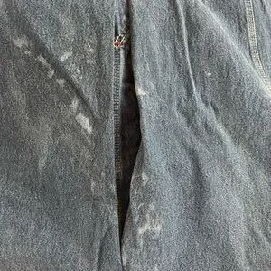 Dickies denim bib overalls with front pouch pocket. Brass-tone buttons and adjustable straps. Red logo patch at chest. Durable denim construction. Lots of patina, some roughed up spots near back of cuff, then either bleach or paint staining on legs. Boho Chic! See photos