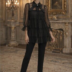 Delicate sheer blouse with dotted texture. Tiered ruffle body creates soft volume. Long sheer sleeves with ruffle cuffs. Decorative bow at the neck with jewel center. Button-front closure adds refinement.