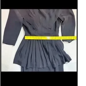 Vintage black peplum dress, likely dating from the 1940s, featuring structured shoulders and a pleated waist detail