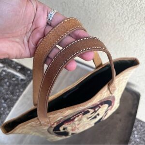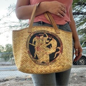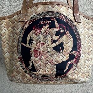 This stylish woven tote bag features a unique mythical design, perfect for adding a touch of elegance to any outfit. The tan color complements a variety of looks, making it a versatile addition to your wardrobe.
