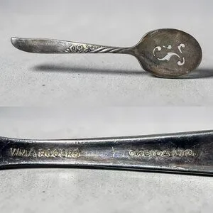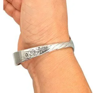 Crafted from a vintage Wm. A. Rogers Oneida Ltd. silver-plated sugar sifter spoon in the intricate "Wildwood" pattern, this bracelet combines timeless elegance with handmade artistry. Enhanced with a beautiful Larimar stone, and soft-soldered rose patterns, it reflects mid-century design aesthetics and adds a unique, sophisticated flair to any jewelry collection.