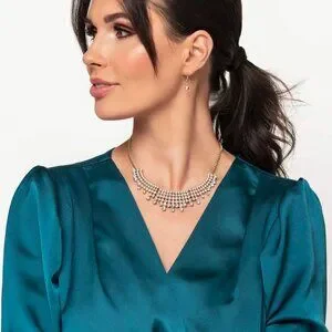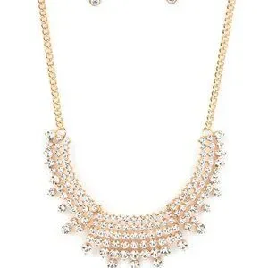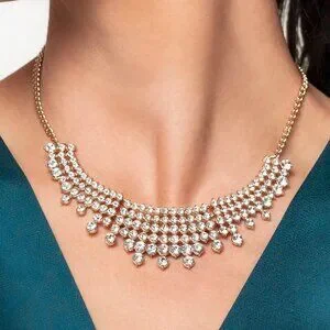 Shimmery strands of multi-sized white rhinestones majestically morph into gold framed layers along the collar for a sparkling statement piece. Features an adjustable clasp closure.