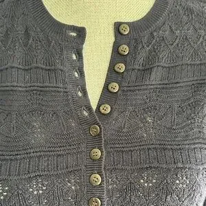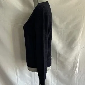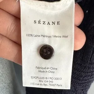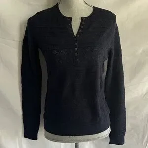 Soft navy knit sweater by Sézane. Henley-style button placket at the center. Ribbed neckline and hem. Lightweight textured stitch for layering.