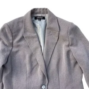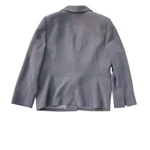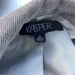 Keywords: Kasper pant suit, gray blazer, women's suit, size 18, single-breasted, notched lapels, professional wear, business attire, elegant suit, polyester suit, long sleeve blazer, fully lined, one-button closure, pre-owned suit, women's fashion.