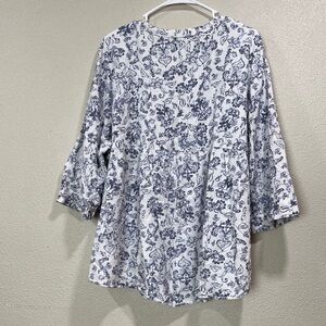 Charming white top with delicate blue floral print. Lightweight, breathable fabric for all-day comfort. Button-front V-neck and roll-tab sleeves for versatile styling. Easy-to-wear piece that pairs well with jeans or skirts.