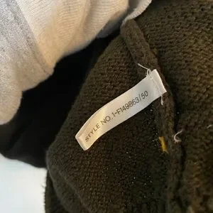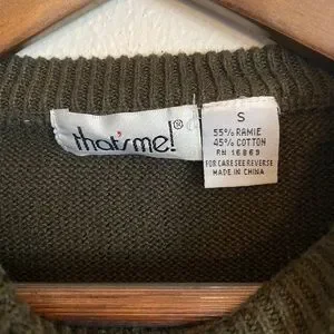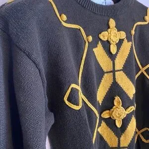 This sweater is by That’s Me! And is a size small. It is olive green and gold/yellow. It has a slight balloon sleeve. It has 3-D roses and puffs on the front. It is in EUC condition and has no stains, holes or pulls.