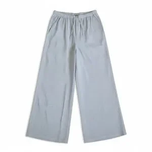Light blue and white pinstripe wide leg pants. Elastic drawstring waist. Breezy, relaxed silhouette. Classic summer staple.
