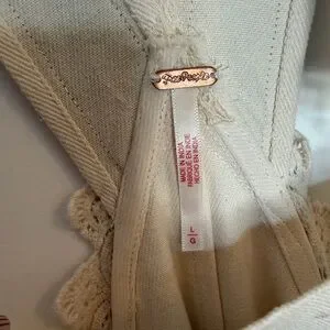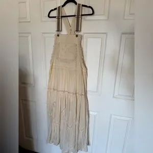 Bohemian tiered apron dress with lace trim. Adjustable suspender straps. Soft flowing fabric with embroidered accents. Lightweight and breezy. Neutral cream tone for versatile styling.