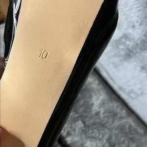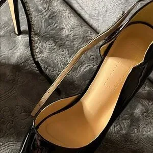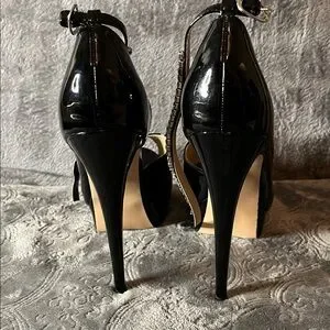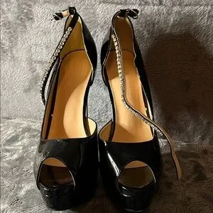 Shiny black patent peep-toe platform heels with a sparkling rhinestone ankle strap. Cushioned insole for comfortable wear and a sculpted stiletto for a confident silhouette. Perfect for evening events and dressy occasions. Rhinestones a tad lose on right shoe as shown in picture #4. Slight scuff on heel of left shoe as shown in picture 13. Measurements are in pictures.