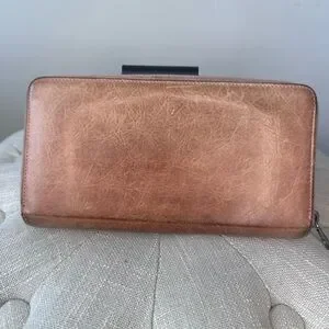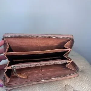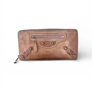 Premium pre-loved dusty pink leather wallet designed for everyday use. Secure zip-around closure and external zip pocket for quick access. Multiple internal compartments organize cards and cash. Classic wallet complements any style.