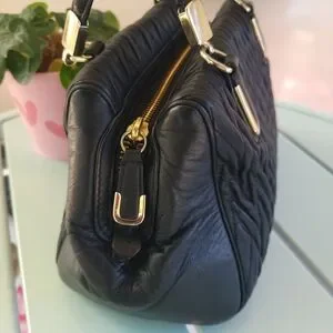 Refined black satchel from Coach. Quilted textured leather exterior. Dual top handles for easy carry. Gold-tone hardware accents. Sleek structured silhouette for day-to-night wear.