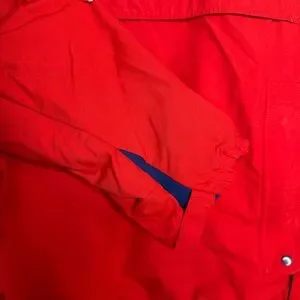 Classic Patagonia jacket in vivid red with navy zipper and logo trim. Features embroidered Patagonia logo. Clean, sporty look for outdoor wear.