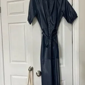 Sleek navy faux-leather midi dress with button-front closure. Self-tie waist defines the silhouette. Short puff sleeves add subtle volume. Versatile and polished for day or evening.