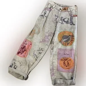Loose wide-leg pants with colorful graphic patch prints. Acid-wash lavender-gray base with orange and pink accents. Elastic waist and relaxed fit. Bold vintage-inspired motifs throughout.