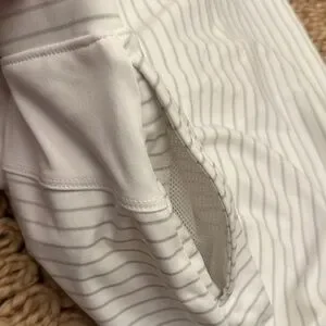 The subtle stripe design and neutral white color make this an easy piece to pair with polos, tanks, or athletic tops.