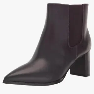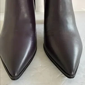 Sleek pointed-toe Chelsea ankle boot in rich eggplant leather. Comfortable elastic side panels for easy on-and-off. Stable block heel for all-day wear. Versatile plum shade pairs well with casual and dress looks.
