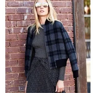 Like New Vince Plaid Bomber Jacket Women’s Black & Gray, size M. Tailored plaid bomber jacket in black and gray. Ribbed trim for a polished silhouette. Lightweight yet warm layering piece. Versatile style that pairs well with dresses and knits. Worn once; sadly, it was always a bit too tight on me. Tag is removed, but it was still in the jacket pocket (see photo). Smoke-free home.