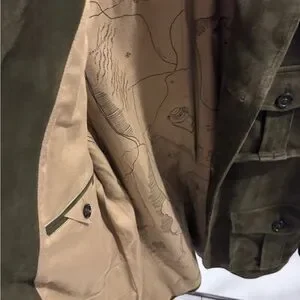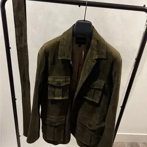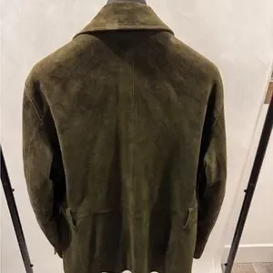 Suede field jacket with button-front closure. Four front flap pockets for practical storage. Soft suede surface with refined texture. Stand collar and tailored seams for a structured fit. Classic olive shade suitable for layered looks. Includes removable matching suede belt. Please feel free to ask any questions before marking an offer or purchasing.