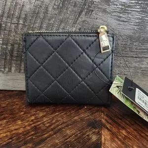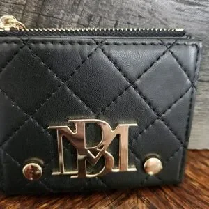 NWT Stylish black quilted mini wallet from Badgley Mischka. Features a gold-tone logo accent and secure zip closure. Compact and elegant for everyday use. Black color complements any outfit.