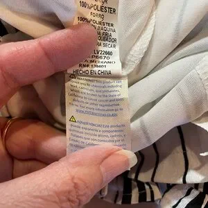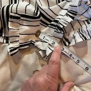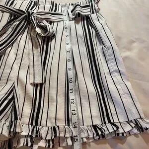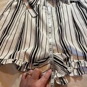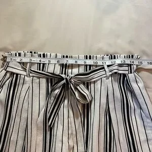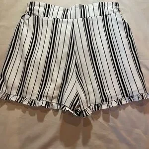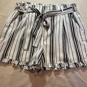Stylish Love paper bag crepe shorts featuring a chic black and white striped design. Has pockets, tie-waist, and ruffles around legs. Perfect for casual outings or a day at the beach. Great condition. Measurements in pictures. Size medium.