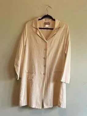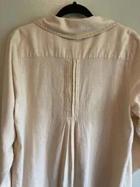 Vintage April Cornell button-up Dress or Jacket in a classic cream color. This linen blend piece features intricate embroidery("French Knots") details along the collar and pockets , offering a cottagecore or boho aesthetic. Crafted from a breathable 55% linen and 45% rayon blend, it is perfect for warm weather or layering. Features Long sleeves, pockets, and iridescent sea shell-style buttons. Beautiful three pleat motif on the back of the garment. Excellent pre-owned condition with no visible flaws.