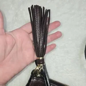 Features: Decorative leather tassel, secure zip-top closure, and a front flap pocket with a turn-lock style accent.