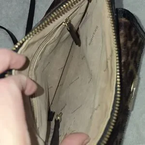 Beautiful authentic Brahmin crossbody bag featuring a luxurious hair-on calf leopard print front panel, genuine leather construction, and black croc-embossed Melbourne trim. Gold-tone hardware with signature Brahmin plaque a little bit scratch on the lock