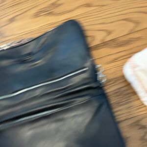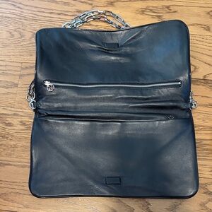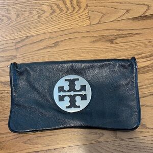 Sleek black leather wristlet by Tory Burch. Features a large silver logo medallion on the front. Polished silver chain strap adds shine. Compact and refined for evening or casual wear. Very good condition slight show of wear on seam shown in photo. Removable strap. Two interior zipper pockets.