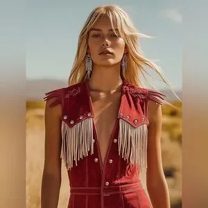 Make a statement at events with this elegant red suede western cowboy style jumpsuit. The sophistication of this stunning jumpsuit is combined with the eye-catching metal button design to create a look that is both modern and timeless. This jumpsuit exudes a noble and elegant aura, while the hem adds a touch of glamour and movement to every step.