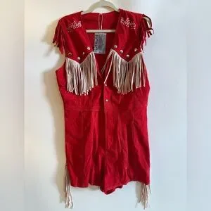 Oyrosy Western Cowboy Style Red Suede Silver Button Beige Tassel Jumpsuit NWT