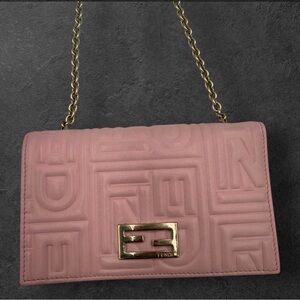 Elegant Fendi clutch in soft pink quilted leather. Gold chain strap and gold logo plaque. Compact design with embossed FF motif. Refined and feminine accessory.