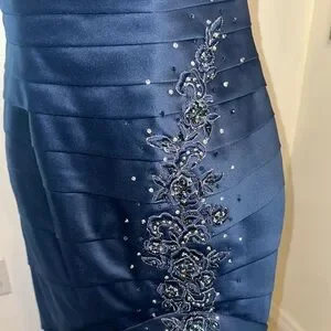 This dress is absolutely stunning! This strapless evening gown features a rich navy color, perfect for formal occasions. The elegant design is enhanced with intricate detailing, making it a standout piece for any event. It is made extremely well and has a figure flattering fit. Brand new without tags and perfect. A real head turner! Note: The side zipper goes all the way up,