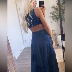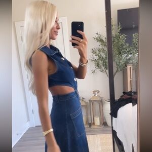 Chic blue denim dress featuring gold buttons. Sleeveless design with front Slit.
