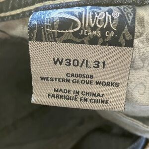 Classic dark blue flared jeans by Silver Jeans. Subtle whiskering and fading for dimension. Contrast stitching along seams adds detail. Flared leg for a balanced silhouette. Versatile style for casual outfits.