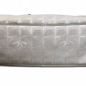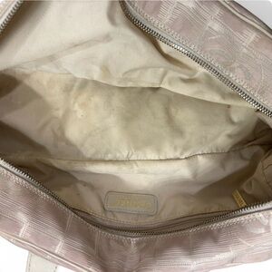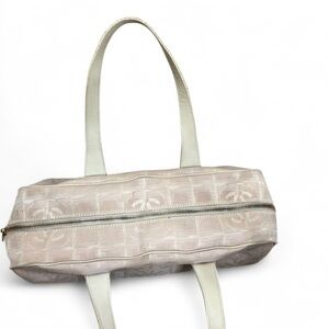 The product is an authentic vintage Y2K Chanel pink logo shoulder bag. It features a cylinder shape with a zip closure and double beige handles made of leather. The exterior is made of jacquard fabric with gold hardware accents, and the interior is lined with beige canvas and includes inner pockets. This designer bag is a stylish and timeless accessory for women looking to add a touch of luxury to their outfit. Great condition, just needs a good cleaning.
