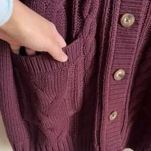 Cozy cable knit with button front. Deep pockets for convenience. Perfect for layering.