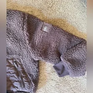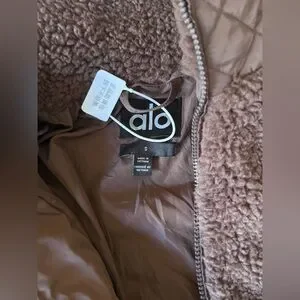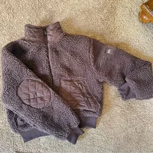 Warm brown sherpa jacket with soft texture. Ideal for layering.