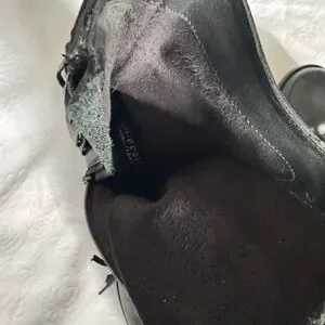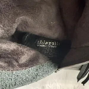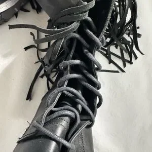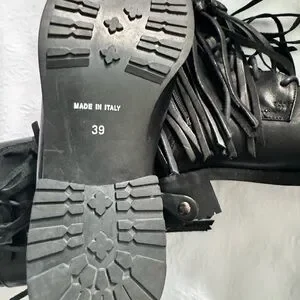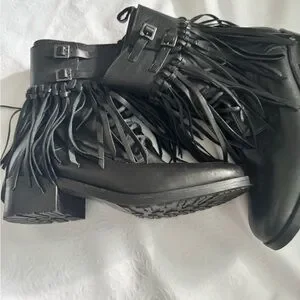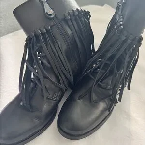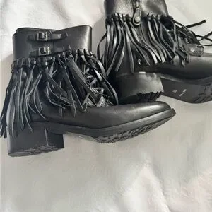 Fabianelli Italian Made Leather Boots, black ankle booties featuring cascading fringe for a statement look. Dual buckle straps add edgy detail and secure fit. Sturdy block heel and lug sole provide everyday comfort and traction. Versatile black color pairs easily with casual and dressed-up outfits. never worn, new without tags.