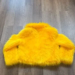 Bold yellow faux fur cropped jacket. Soft plush faux fur for statement looks. Open front with a cozy collar. Perfect for adding a pop of color to outfits. HAS POCKETS!