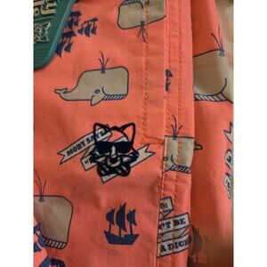 The Party Pants "Moby Says: 'Don't Be A Dick' Swim Board Bright Coral peachShorts are a stylish and functional addition to any man's swimwear collection. Made from a blend of cotton, polyester, and Spandex, these peach and gray and board shorts feature a fun whale and ship pattern. With an elastic waist, drawstring closure, and inner key pocket, these shorts offer both comfort and convenience for activities like training, surfing, and recreational swimming. The bold design and unique message make these shorts a standout choice for beach parties or casual outings. NOTE: NOT lined.