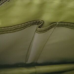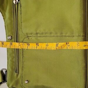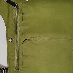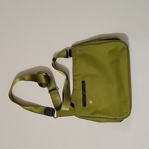 Baggallini "Mosey" nylon crossbody bag with multiple compartments in Grasshopper (lime green) color. Features 2 prominent front zippered slip pockets and a zippered horizontal pocket above them. A back pocket handy to carry a phone. Good pre-owned condition with some wear on top of pockets. Offers welcome.