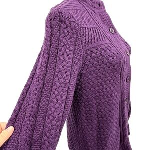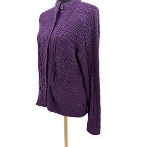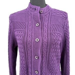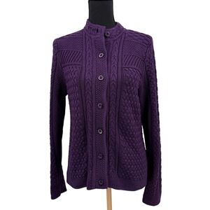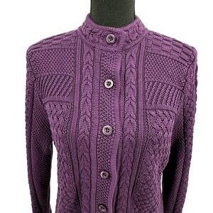 L.L. Bean Women's Sweater Cable Knit Purple Button Front Collarless Cotton Med