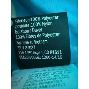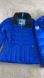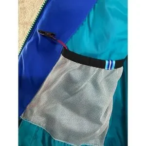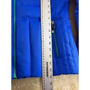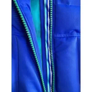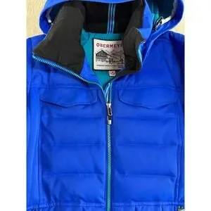 Obermeyer ski jacket in a vibrant cobalt blue with contrasting teal and green zipper details. This technical winter coat features a down and polyester blend insulation for superior warmth on the slopes.