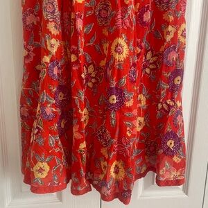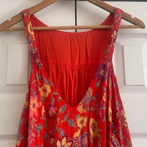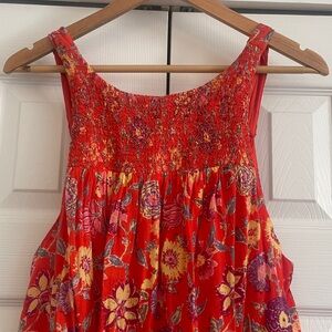 Vibrant red dress with floral pattern. Sleeveless design. Perfect for casual outings. Runs large.