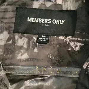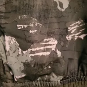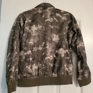 Lightweight zip-front jacket with full-length sleeves. All-over camo and abstract print in olive green and white. Ribbed cuffs and hem. Versatile casual outerwear.