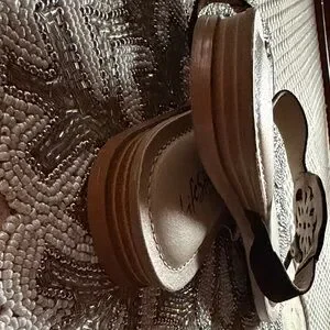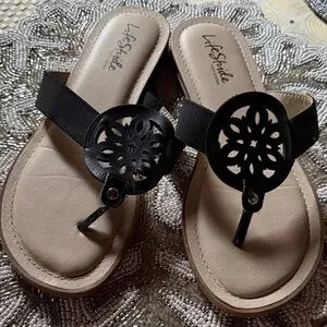 Elegant black strap sandals with tan footbed. Stylish cut-out design. Ideal for casual outings.