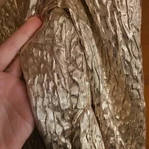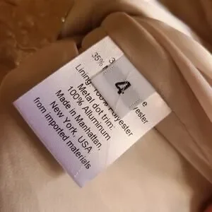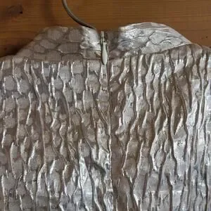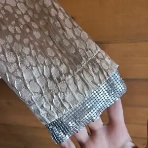 This top is stunning, a beautiful champagne color that looks stunning in the light. Side zip and back of neck zipper both work smoothly. Metallic chainmail cuffs add a fun detail worn for about an hour for photos.
