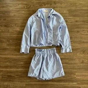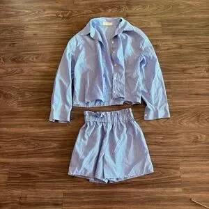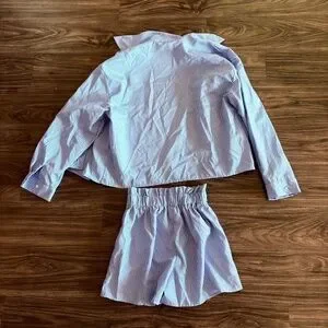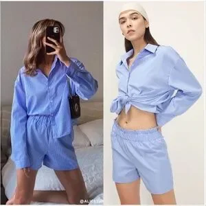 The co-ord set ; A pin striped shirt and a mini length shorts 2-piece set