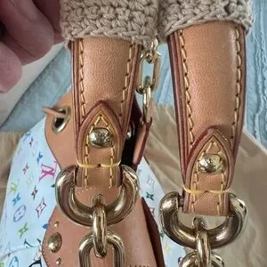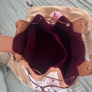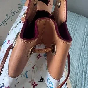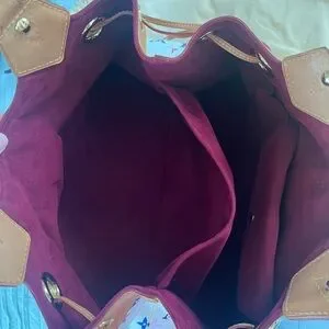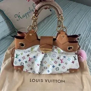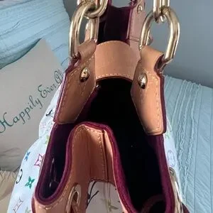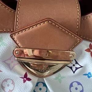 GM Louis Vuitton Ursula multicolor monogram on white canvas. Excellent condition. Burgundy suede interior super clean no call outs, and no smell. Patina is light golden color with gold-tone hardware in clean condition. Top handles are covered with tan knitting covers to protect the vachetta from getting dirty, handles are