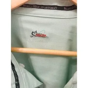 Up for sale is a World Wide Sportsman long sleeve fishing shirt in men's size Large. Classic performance fishing shirt build — lightweight ripstop-style nylon fabric, snap button front, dual chest pockets with zip and snap closures, roll-up sleeve tabs, and vented panels for airflow on the water.